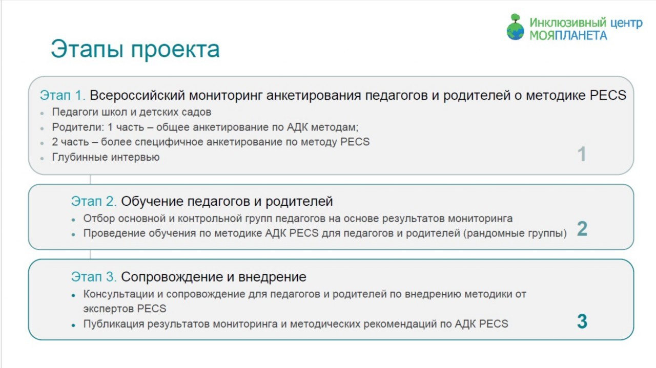 Инклюзивный центр «Моя планета», ФГБНУ «Институт коррекционной педагогики», ФРЦ РАС МГППУ (Федеральный ресурсный центр по организации комплексного сопровождения детей с расстройствами аутистического спектра), Ассоциация «Аутизм-Регионы» и ВОРДИ (Всероссийская организация родителей детей-инвалидов) проводит Всероссийский мониторинг опыта использования педагогами и родителями детей с нарушениями развития методик альтернативной и дополнительной коммуникации.